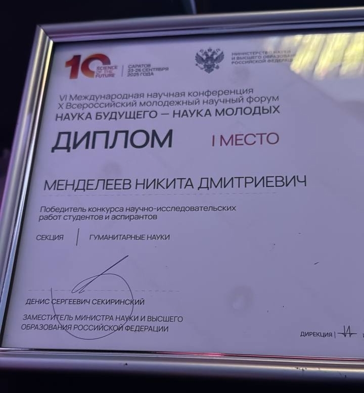 Аспирант 3 года обучения исторического факультета Тверского государственного университета Менделеев Никита Дмитриевич стал победителем (Диплом 1 степени) гуманитарной секции VI Международной научной конференции в рамках X Всероссийского молодежного научного форума «Наука будущего - наука молодых» с темой: «Историко-географическое исследование: реконструкция административно-территориального деления и поселенческой структуры и их локализация (на примере Новоторжского уезда XV-XVII вв.)».