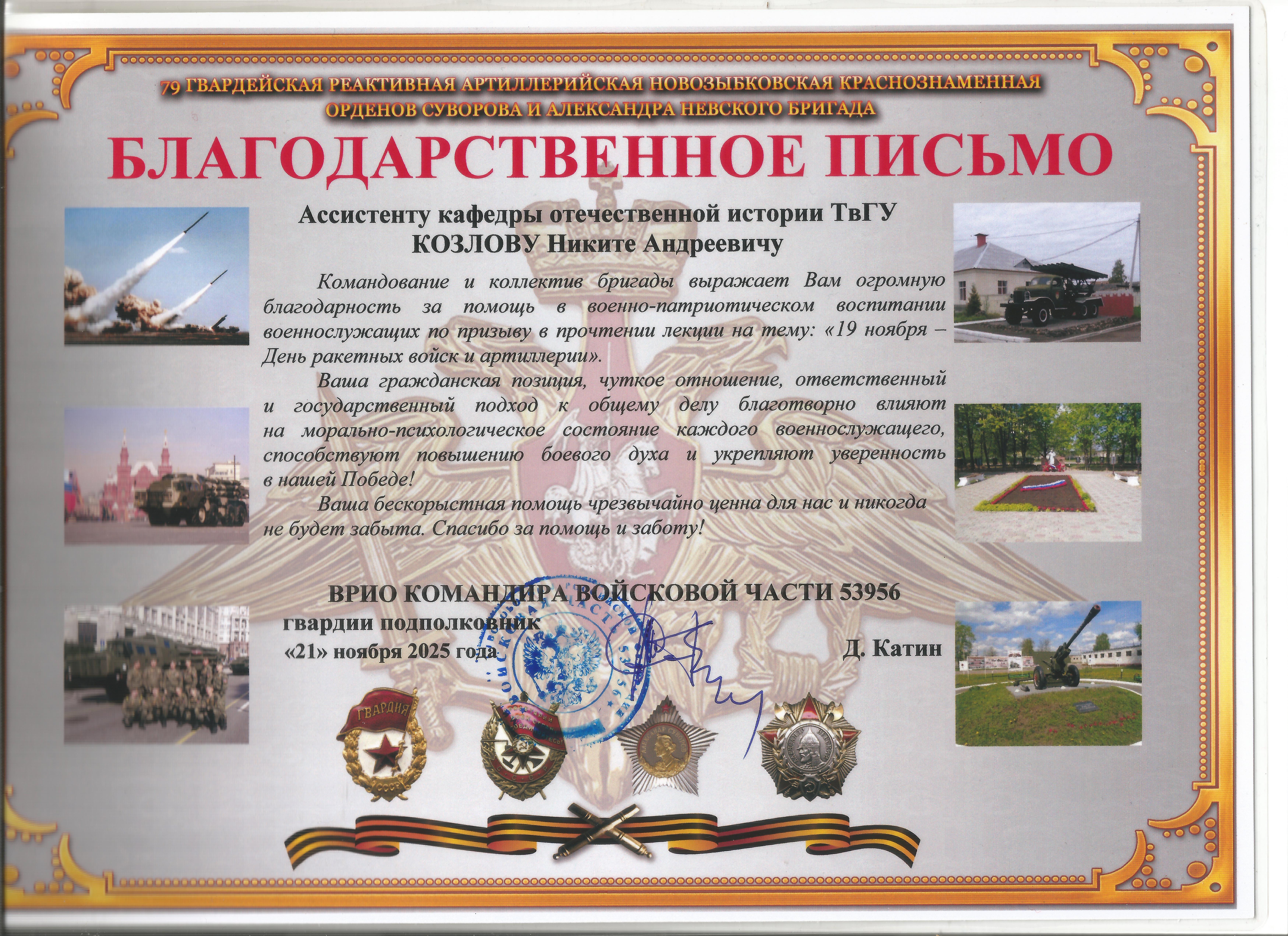 Ассистент кафедры отечественной истории Н.А. Козлов прочитал для военнослужащих по призыву новую лекцию, посвященную памятному дню России и профессиональному празднику - Дню ракетных войск и артиллерии 19 ноября. Лектор рассказал об истории возникновения артиллерии как самостоятельного рода войск в Русском царстве и его совершенствовании в Российской империи, значении советской артиллерии в победе над Германией в Великой Отечественной войне и современных перспективах РВИА. Особое внимание было уделено важнейшим сражениям, в которых русская артиллерия внесла решающий вклад в разгром противника, а также технологическим новшествам, созданным в нашей стране - Царь-пушке, полковой и конной артиллерии, гаубичных орудиях типа "Единорог", системе полевой реактивной артиллерии. За проведение просветительского мероприятия лектор удостоился благодарственного письма от врио командира войсковой части.